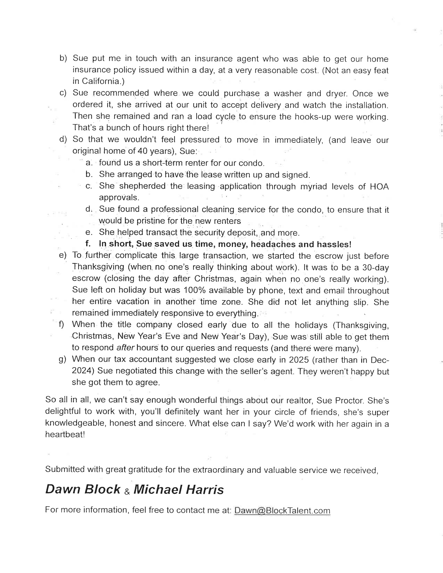Sue Proctor was my Real Estate Broker in two separate transactions: One was helping to sell my family home in Southern California from a very complicated Trust in 2022. The dilapidated property, with a great view, received 6 offers and sold for all cash, $175,000 over asking price and closed in 2 weeks!